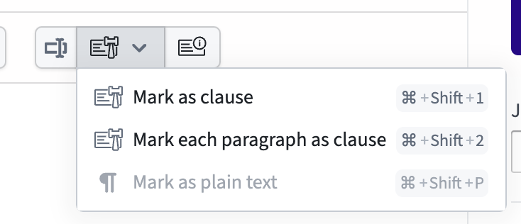 If you wish to automatically mark up large parts of a document (or the entire document) as Clauses, you're able to do this by selecting "Mark each paragraph as clause".