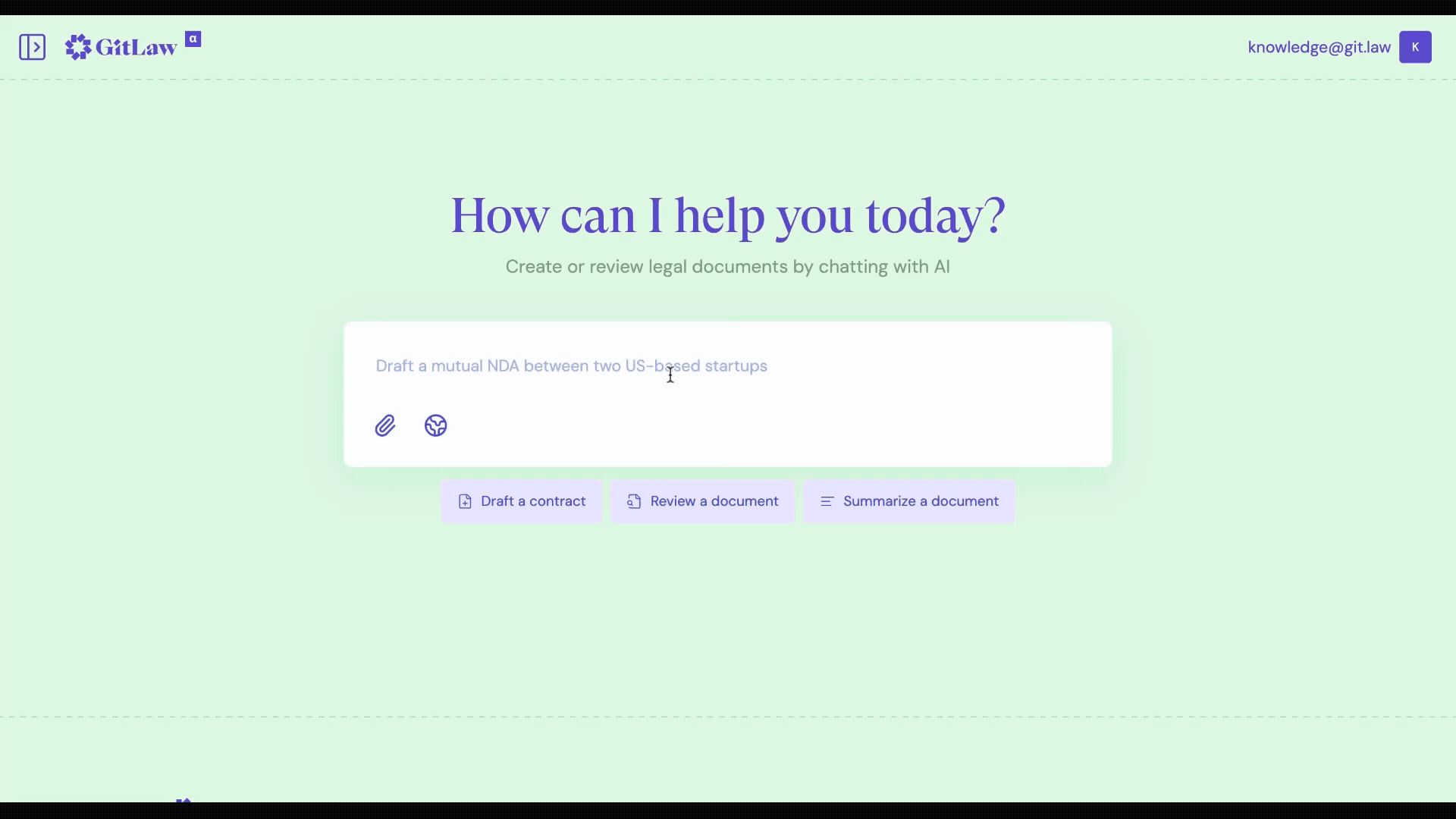 - Describe your needs: Type a clear description of the draft contract you want. For example, “Draft a mutual NDA between two US‑based startups” or “I need a privacy policy for my SaaS website.”